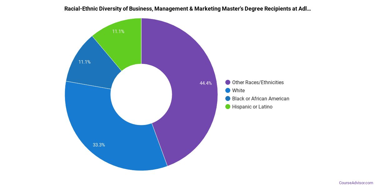 The following table and chart show the race/ethnicity for students who recently graduated from Adler University with a master's in business, management & marketing.
