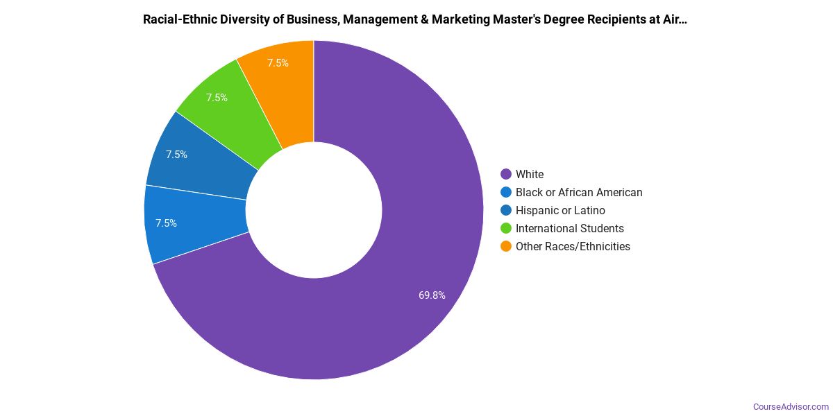 Of the students who received a business, management & marketing master's degree from AFIT Graduate School of Engineering & Management, 60% were white. This is above average for this degree on the natiowide level.