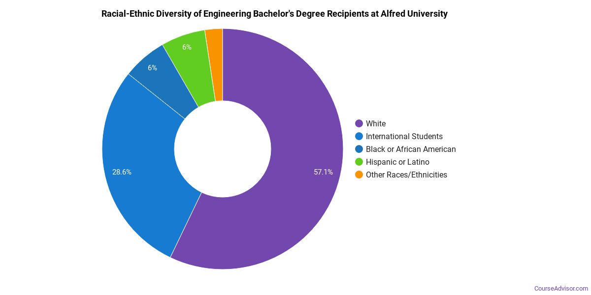 About 67% of those who receive a bachelor's degree in engineering at Alfred are white. This is above average for this degree on the nationwide level.