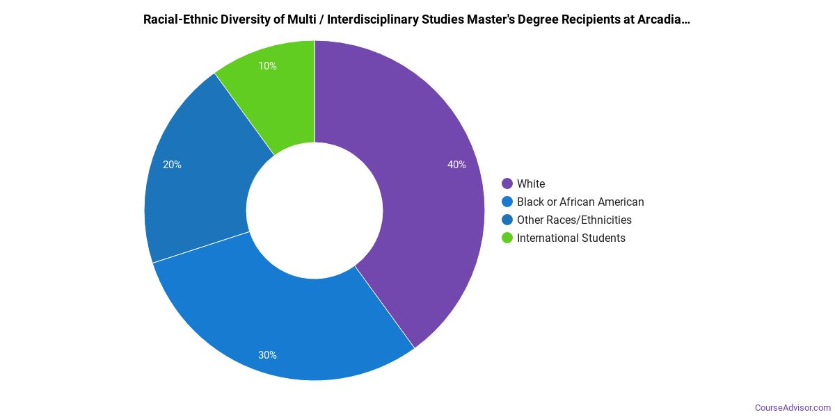 Of the students who received a multi / interdisciplinary studies master's degree from Arcadia, 58% were white. This is above average for this degree on the natiowide level.
