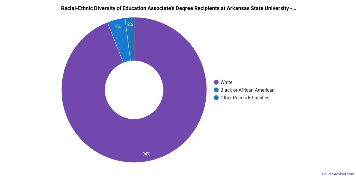 The majority of those who receive an associate's degree in education at ASU-Beebe are white. Around 93% fell into this category, which is below average for this degree.