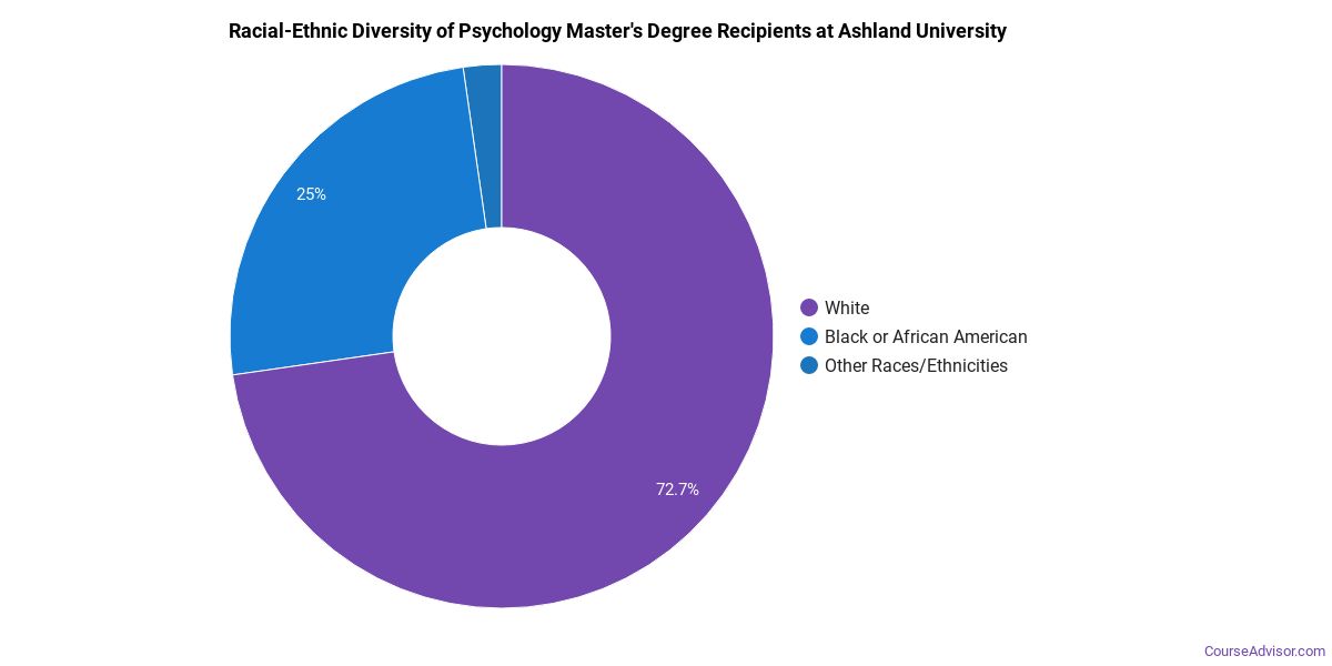 Of the students who received a psychology master's degree from Ashland, 76% were white. This is above average for this degree on the natiowide level.