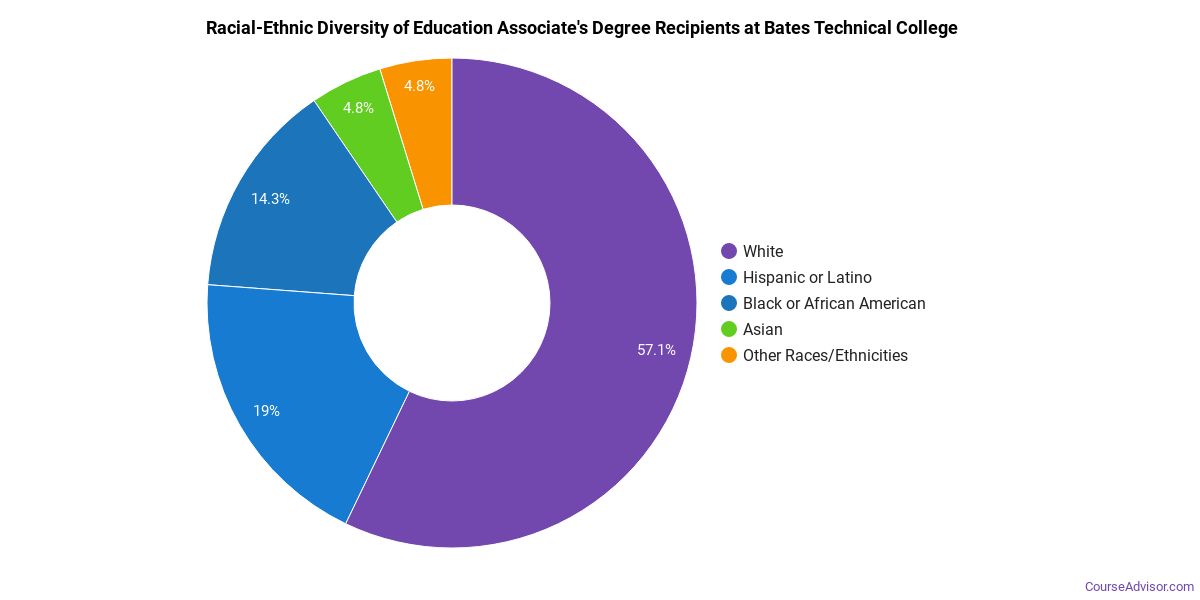 The majority of those who receive an associate's degree in education at Bates Technical College are white. Around 61% fell into this category, which is typical for this degree. Bates Technical College does a better job with serving racial-ethnic minorities than the typical school does. Its associate's program in education graduates 4% more racial-ethnic minorities than the nationwide average.*
