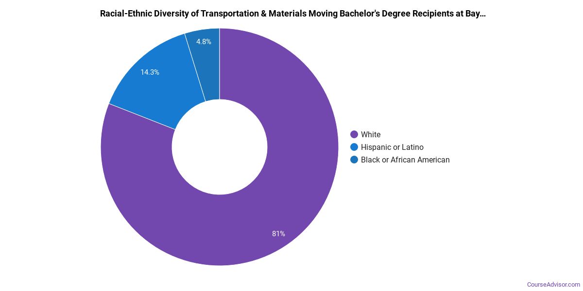 About 87% of those who receive a bachelor's degree in transportation & materials moving at Baylor are white. This is above average for this degree on the nationwide level.