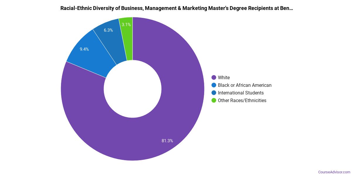 Of the students who received a business, management & marketing master's degree from Benedictine College, 77% were white. This is above average for this degree on the natiowide level.