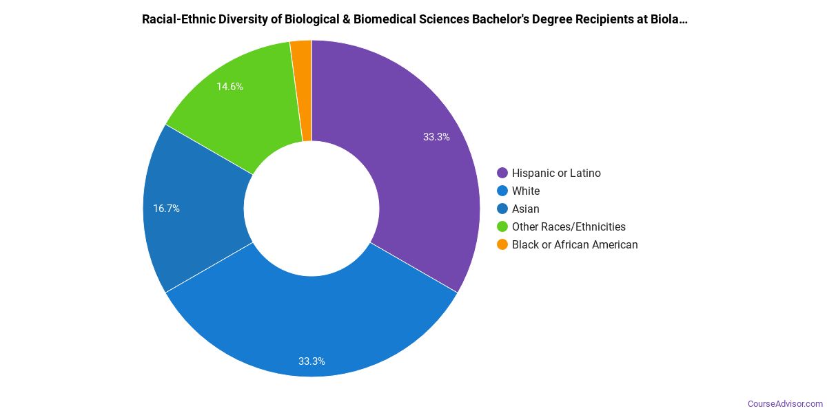 About 57% of those who receive a bachelor's degree in biological & biomedical sciences at Biola are white. This is above average for this degree on the nationwide level.