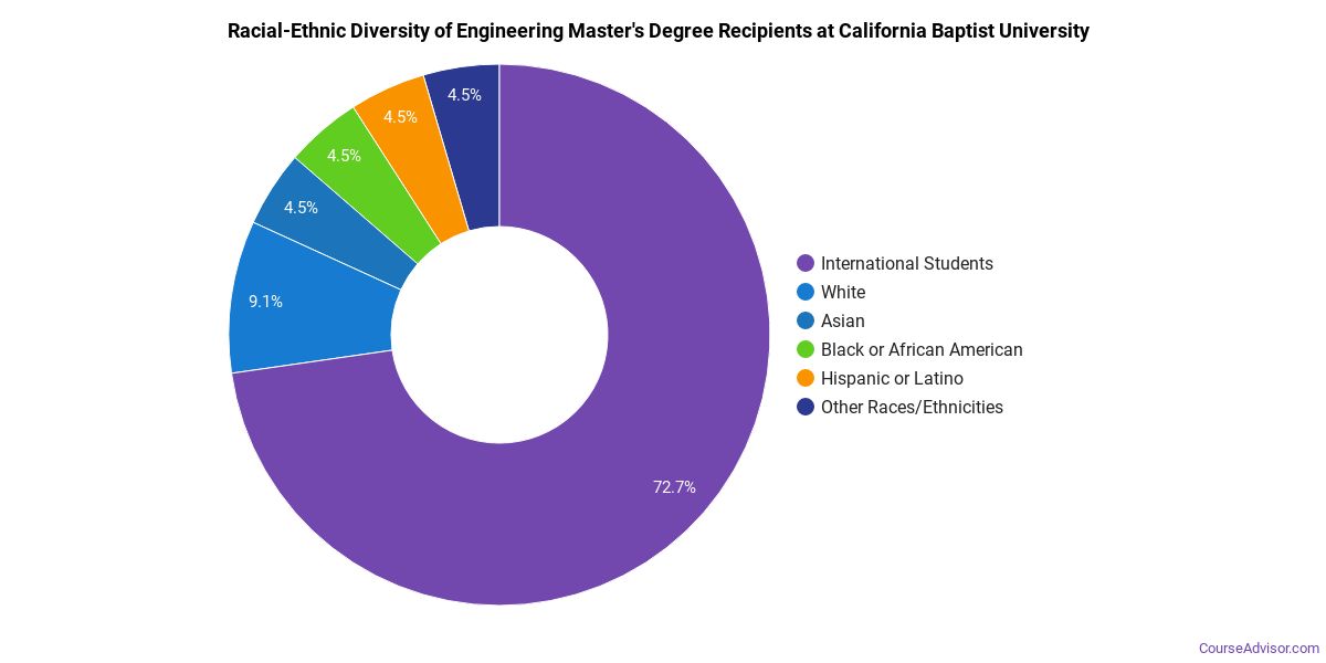 About 51% of those who receive a bachelor's degree in engineering at Cal Baptist are white. This is above average for this degree on the nationwide level. Prospective students may be interested in knowing that this school graduates 12% more racial-ethnic minorities in its engineering bachelor's program than the national average.*