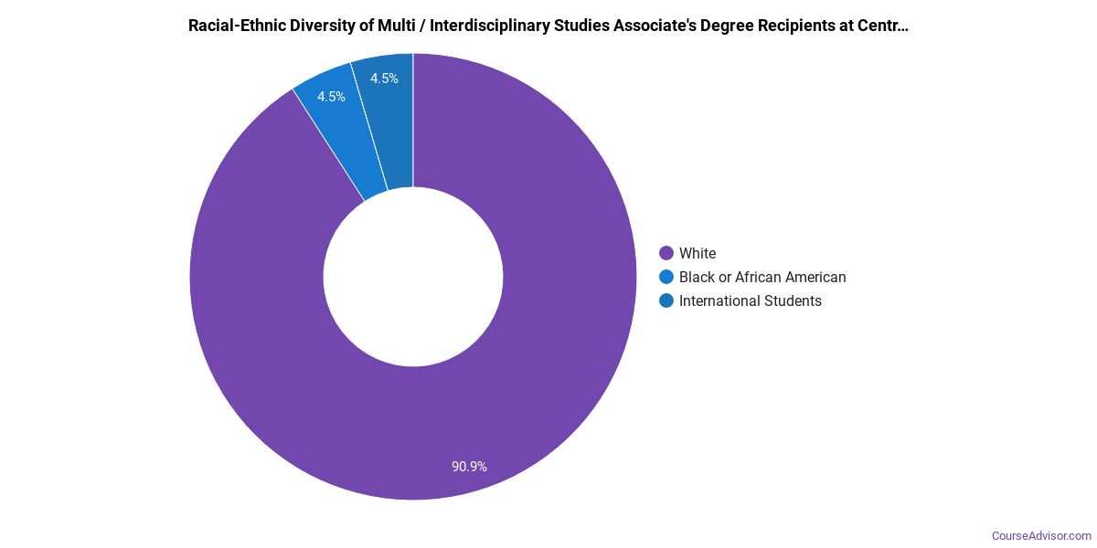 The majority of those who receive an associate's degree in multi / interdisciplinary studies at Central Alabama Community College are white. Around 93% fell into this category, which is below average for this degree.