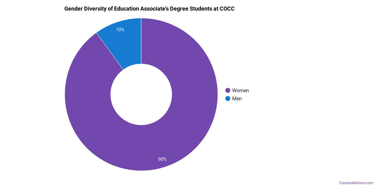 The majority of those who receive an associate's degree in education at COCC are white. Around 57% fell into this category, which is below average for this degree. COCC does a better job with serving racial-ethnic minorities than the typical school does. Its associate's program in education graduates 11% more racial-ethnic minorities than the nationwide average.*