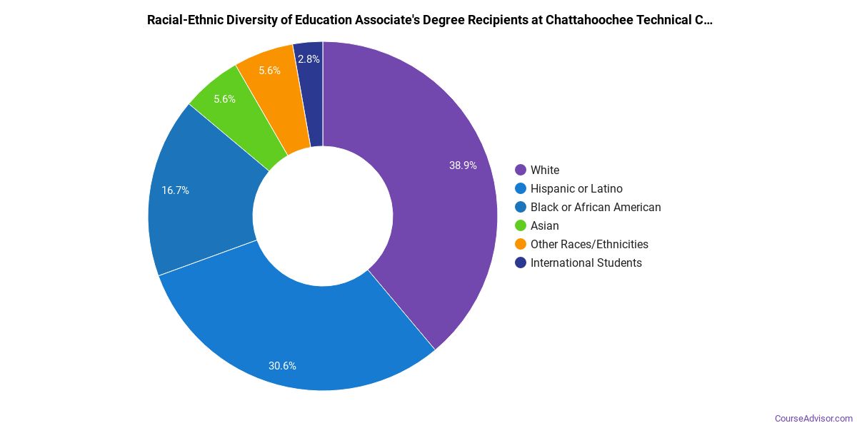 Chattahoochee Technical College does a better job with serving racial-ethnic minorities than the typical school does. Its associate's program in education graduates 23% more racial-ethnic minorities than the nationwide average.*