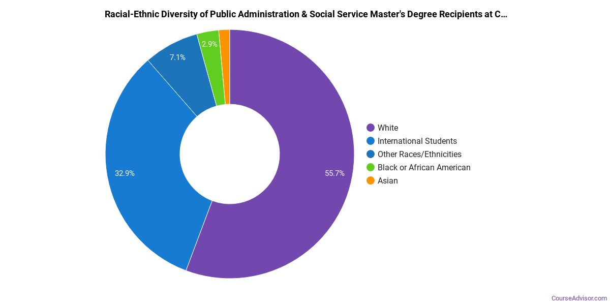 The following table and chart show the race/ethnicity for students who recently graduated from Clark University with a master's in public administration & social service.