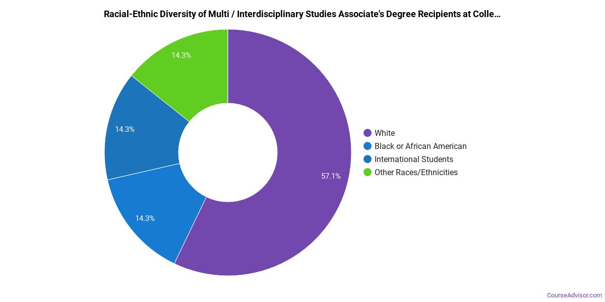 The majority of those who receive an associate's degree in multi / interdisciplinary studies at CSM are white. Around 72% fell into this category, which is below average for this degree.