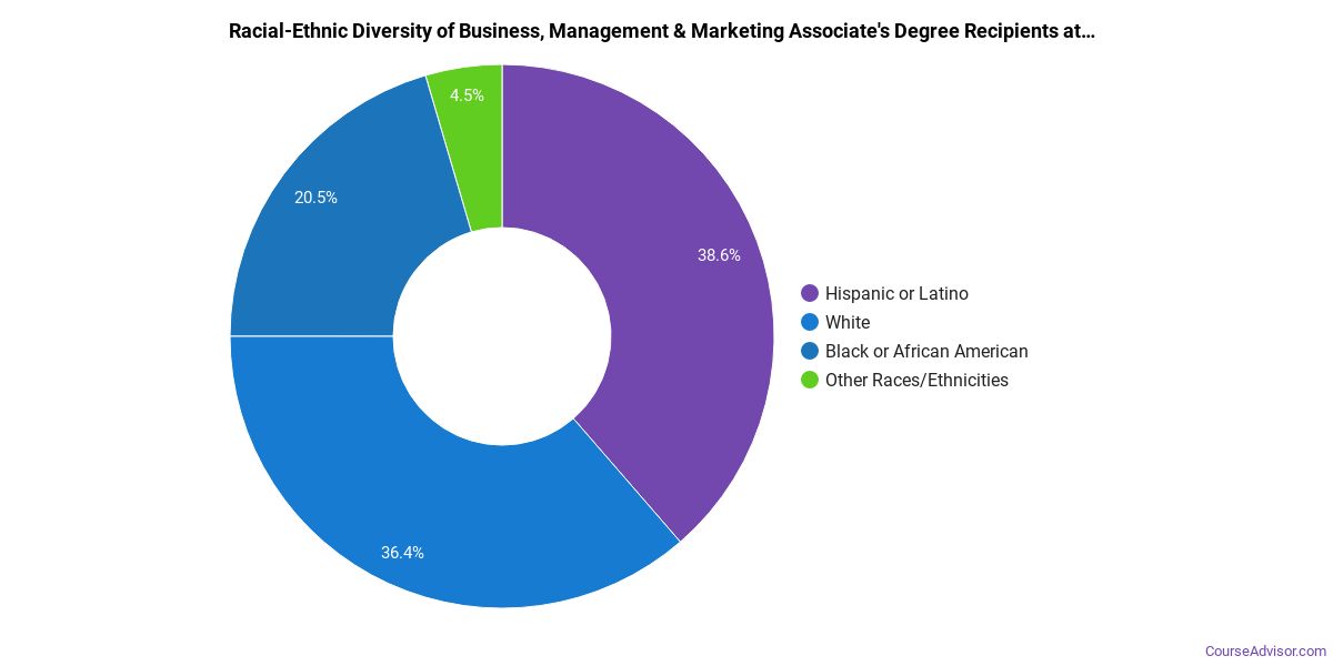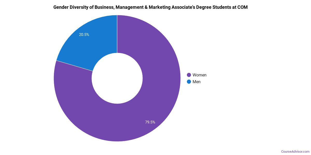 COM does a better job with serving racial-ethnic minorities than the typical school does. Its associate's program in business, management & marketing graduates 12% more racial-ethnic minorities than the nationwide average.*