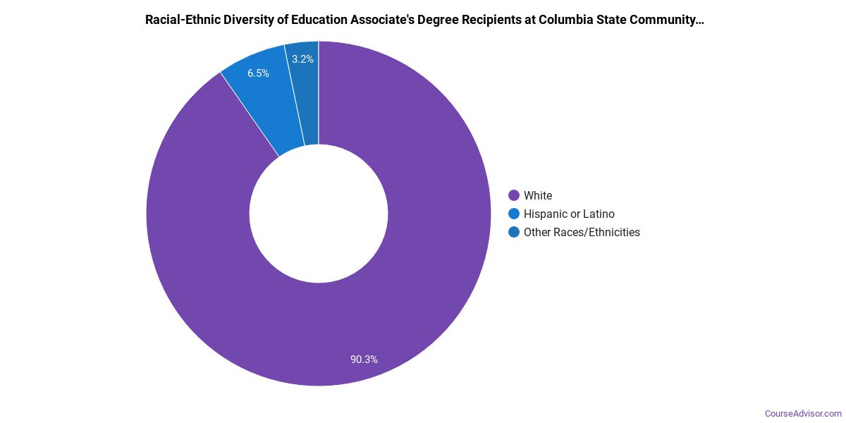 The majority of those who receive an associate's degree in education at Columbia State Community College are white. Around 94% fell into this category, which is below average for this degree.