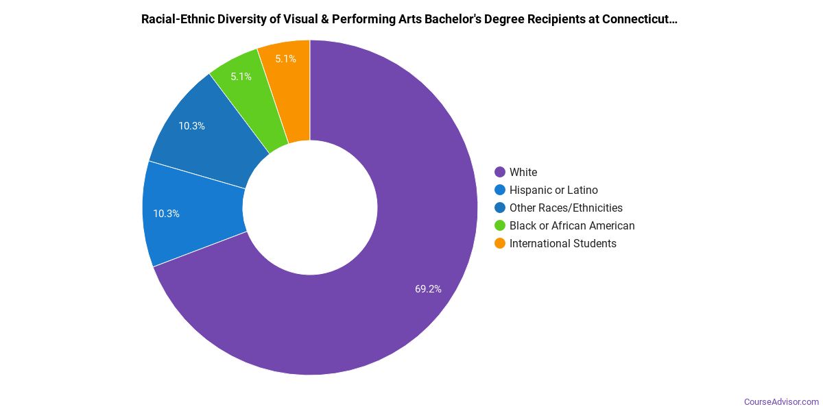 About 71% of those who receive a bachelor's degree in visual & performing arts at Conn College are white. This is above average for this degree on the nationwide level.