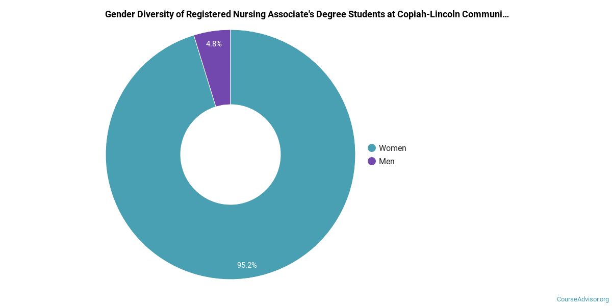 The majority of those who receive an associate's degree in registered nursing at Copiah-Lincoln Community College are white. Around 79% fell into this category, which is below average for this degree.