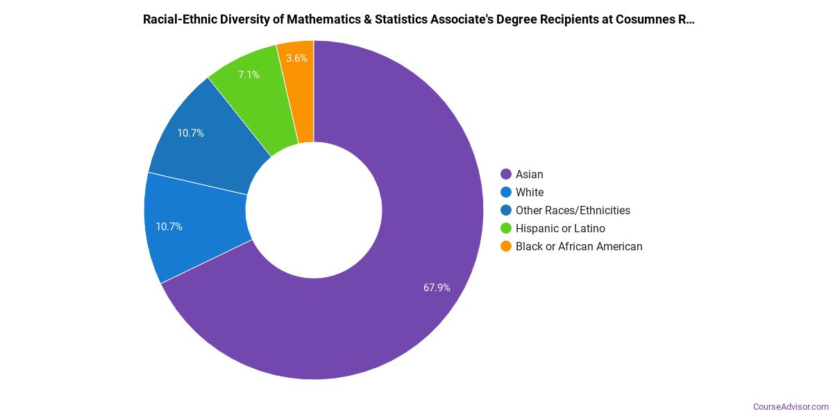 Cosumnes River does a better job with serving racial-ethnic minorities than the typical school does. Its associate's program in mathematics & statistics graduates 30% more racial-ethnic minorities than the nationwide average.*