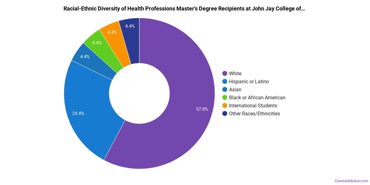 Of the students who received a health professions master's degree from John Jay, 53% were white. This is typical for this degree on the natiowide level.