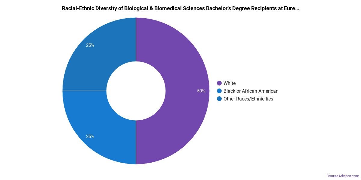 About 86% of those who receive a bachelor's degree in biological & biomedical sciences at Eureka College are white. This is above average for this degree on the nationwide level.