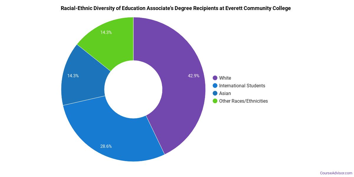 The majority of those who receive an associate's degree in education at Everett Community College are white. Around 56% fell into this category, which is below average for this degree. Everett Community College does a better job with serving racial-ethnic minorities than the typical school does. Its associate's program in education graduates 13% more racial-ethnic minorities than the nationwide average.*