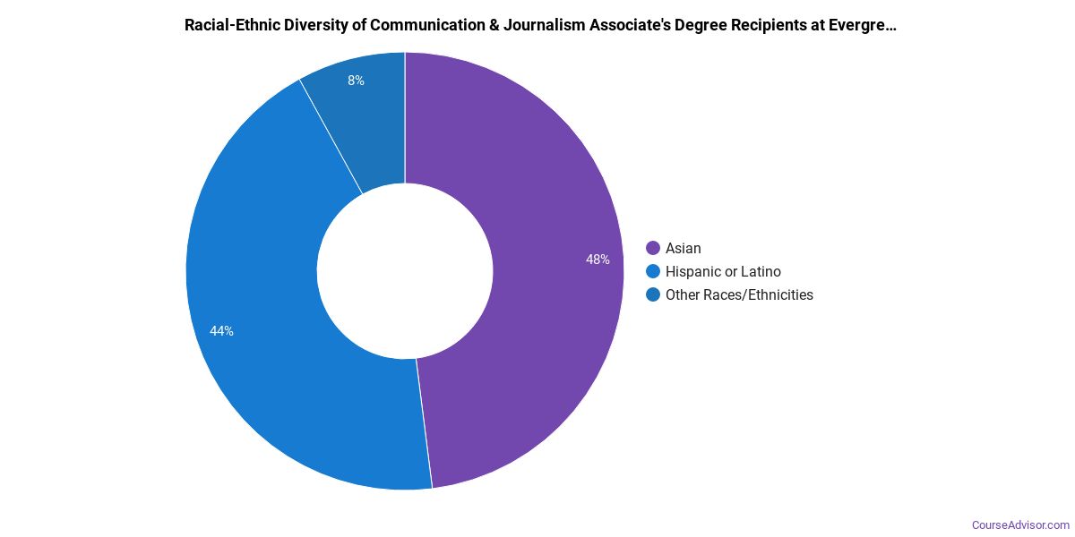 Evergreen Valley College does a better job with serving racial-ethnic minorities than the typical school does. Its associate's program in communication & journalism graduates 46% more racial-ethnic minorities than the nationwide average.*