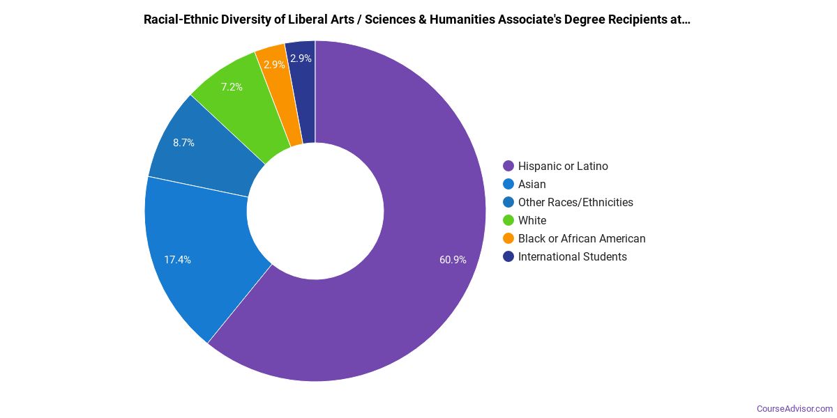 Evergreen Valley College does a better job with serving racial-ethnic minorities than the typical school does. Its associate's program in liberal arts / sciences & humanities graduates 25% more racial-ethnic minorities than the nationwide average.*