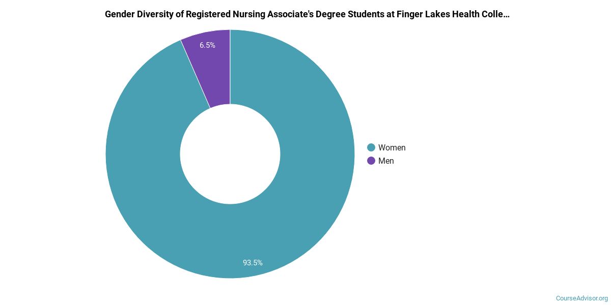 The majority of those who receive an associate's degree in registered nursing at Finger Lakes Health College of Nursing are white. Around 64% fell into this category, which is below average for this degree.