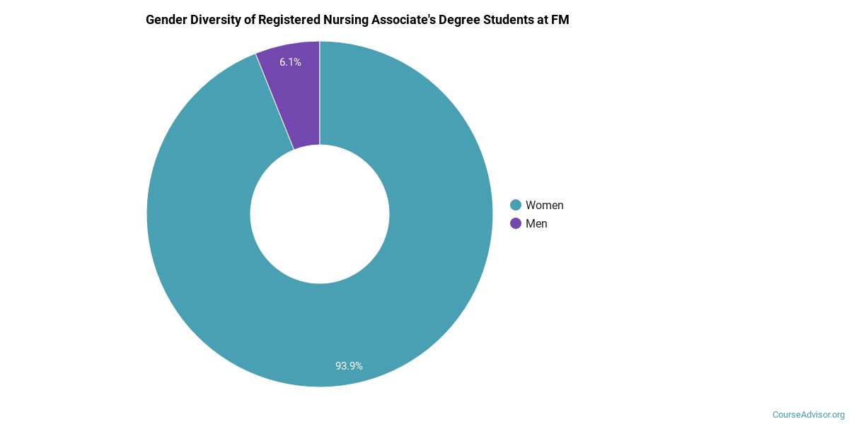 The majority of those who receive an associate's degree in registered nursing at FM are white. Around 81% fell into this category, which is below average for this degree.