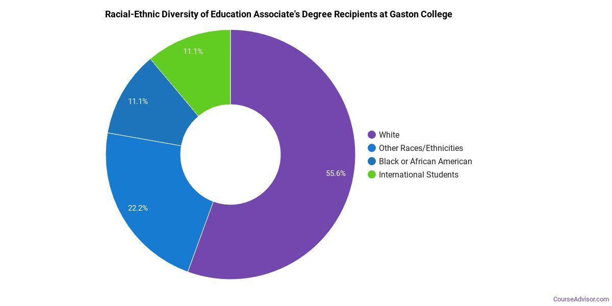 The majority of those who receive an associate's degree in education at Gaston College are white. Around 86% fell into this category, which is below average for this degree.