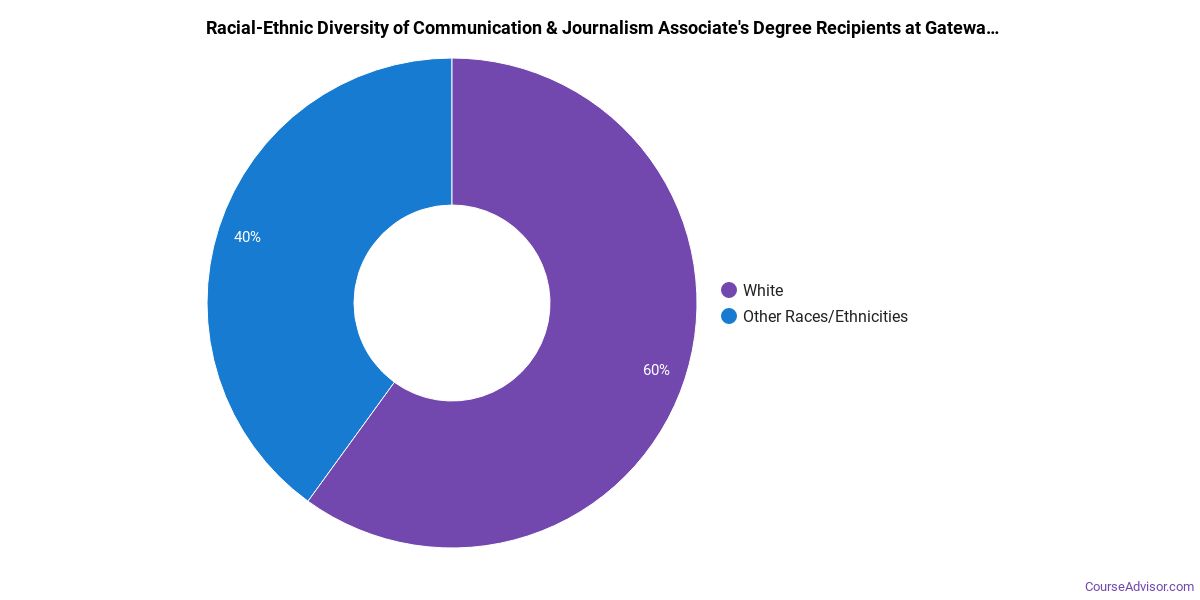 The majority of those who receive an associate's degree in communication and journalism at Gateway Community College are white. Around 60% fell into this category, which is below average for this degree.