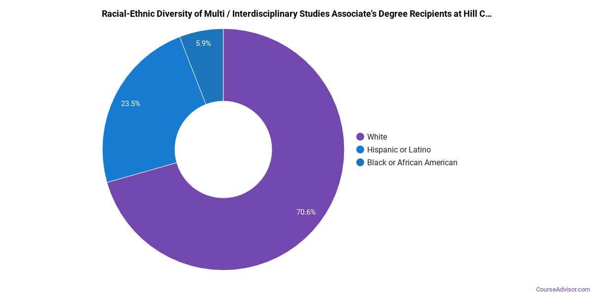 The majority of those who receive an associate's degree in multi / interdisciplinary studies at Hill College are white. Around 65% fell into this category, which is below average for this degree.