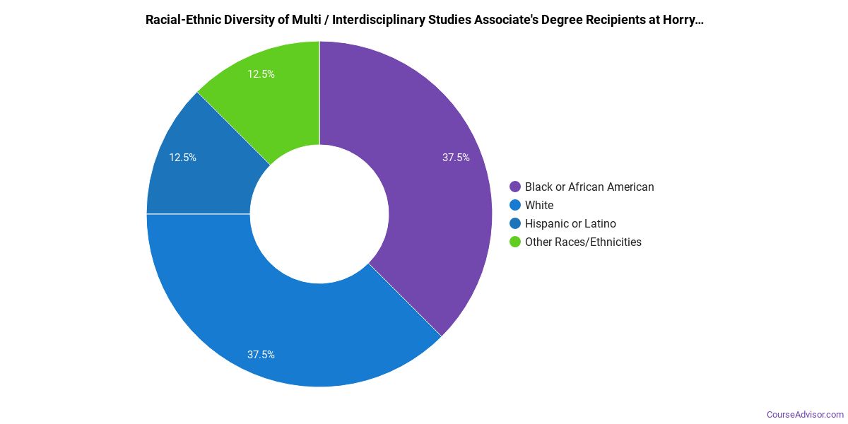 The majority of those who receive an associate's degree in multi / interdisciplinary studies at Horry-Georgetown Technical College are white. Around 73% fell into this category, which is below average for this degree.