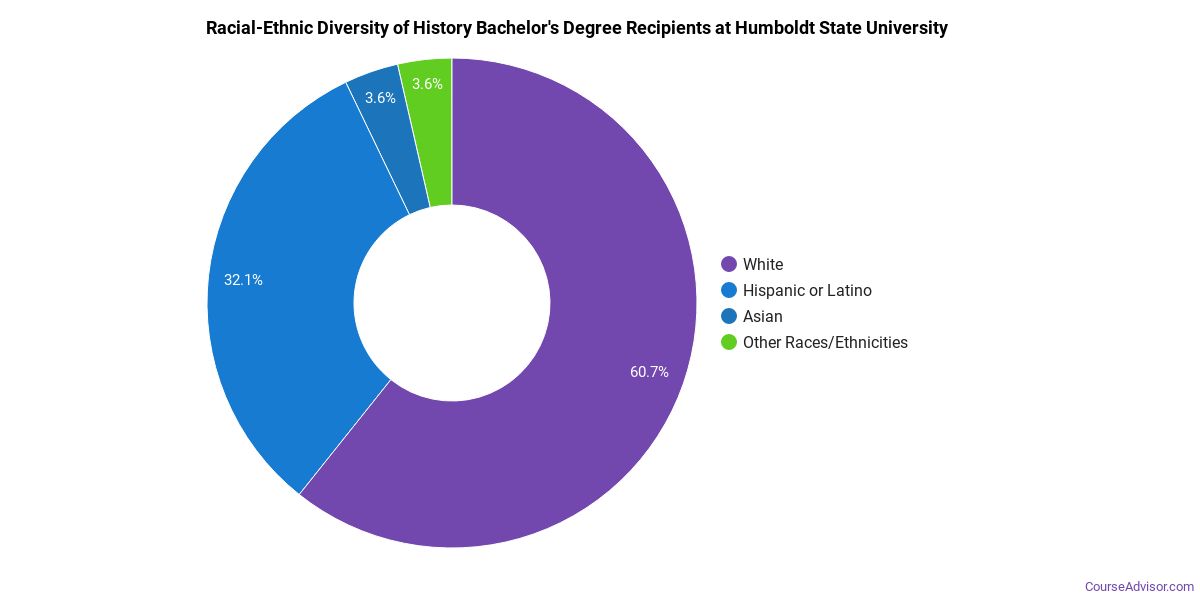About 76% of those who receive a bachelor's degree in history at Humboldt State University are white. This is above average for this degree on the nationwide level.