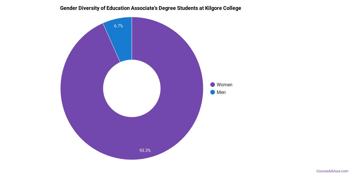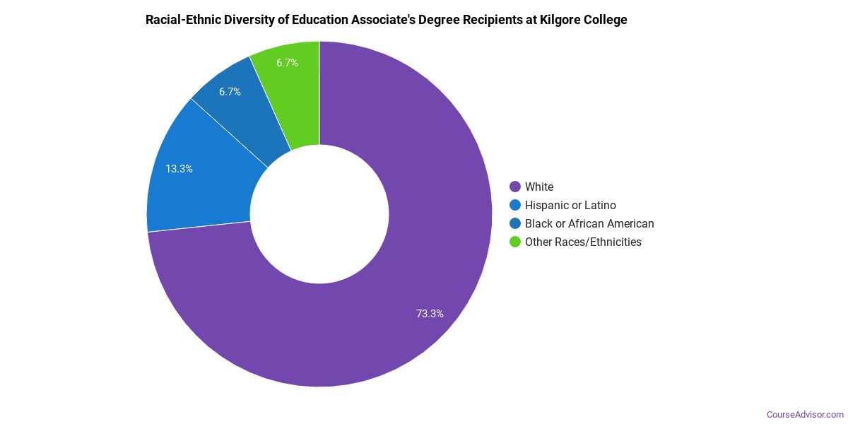 The majority of those who receive an associate's degree in education at Kilgore College are white. Around 90% fell into this category, which is below average for this degree.