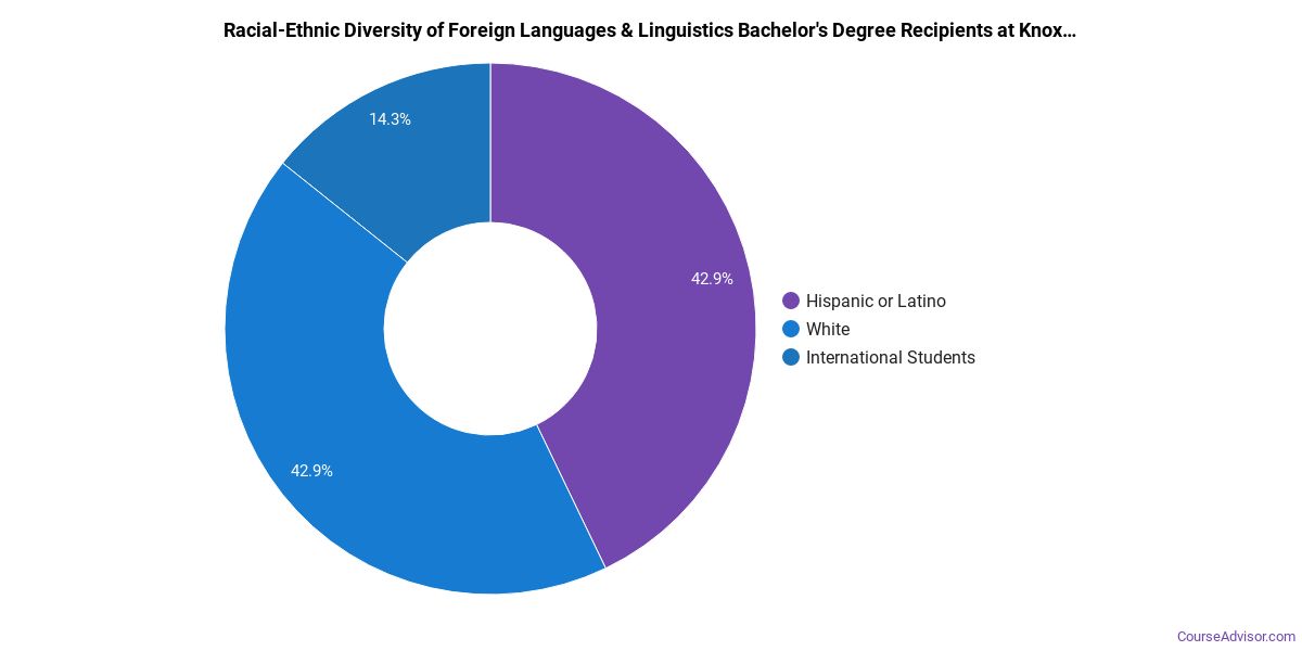 About 67% of those who receive a bachelor's degree in foreign languages & linguistics at Knox are white. This is above average for this degree on the nationwide level.
