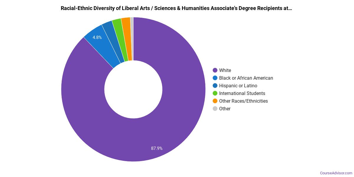 The majority of those who receive an associate's degree in liberal arts / sciences & humanities at Lake Land College are white. Around 85% fell into this category, which is below average for this degree.