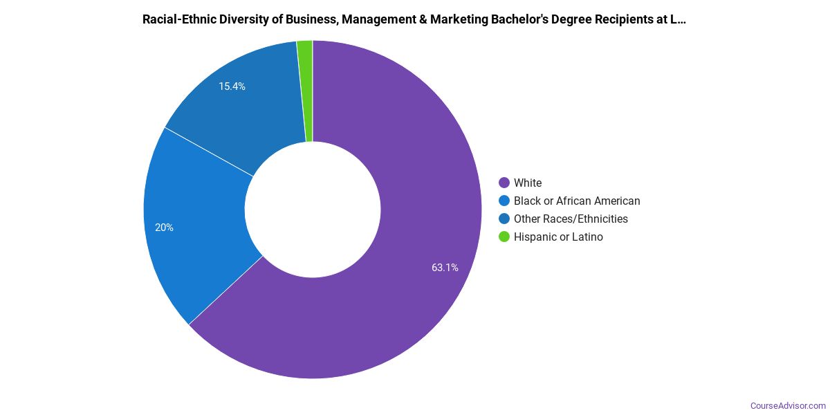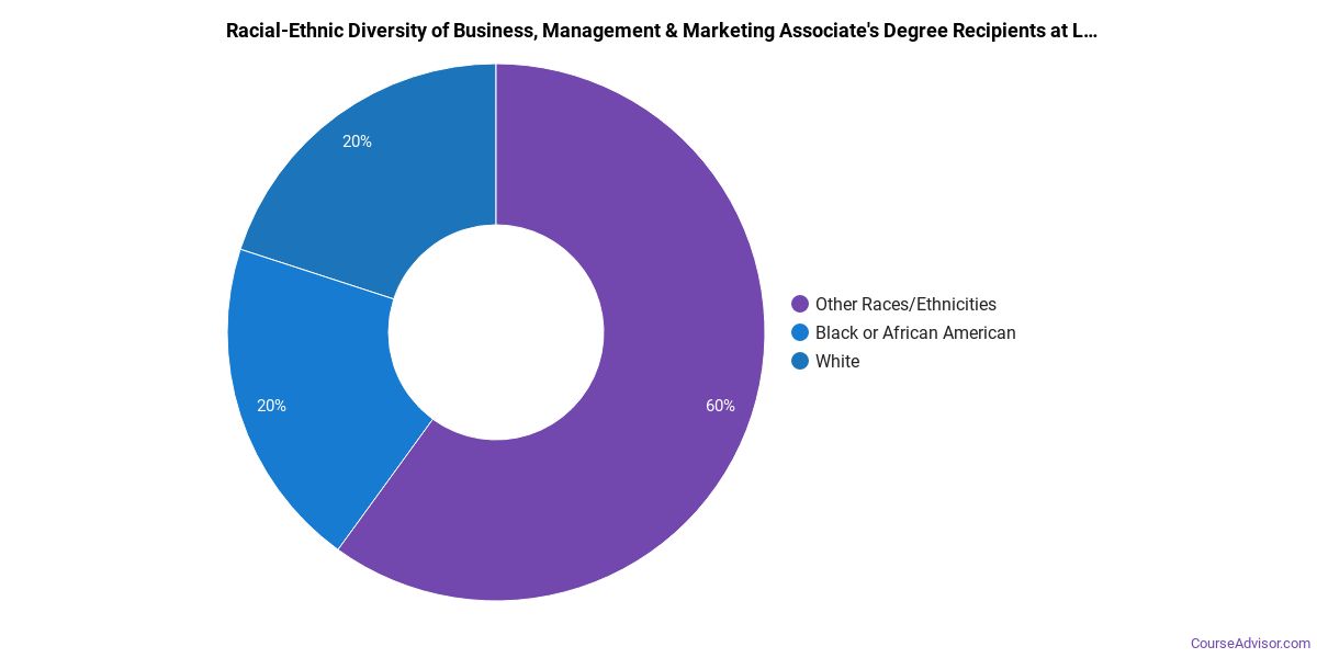 The majority of those who receive an associate's degree in business, management & marketing at Lancaster Bible College are white. Around 60% fell into this category, which is below average for this degree.