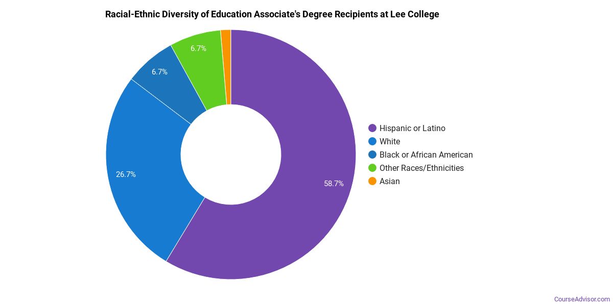 Lee College does a better job with serving racial-ethnic minorities than the typical school does. Its associate's program in education graduates 46% more racial-ethnic minorities than the nationwide average.*