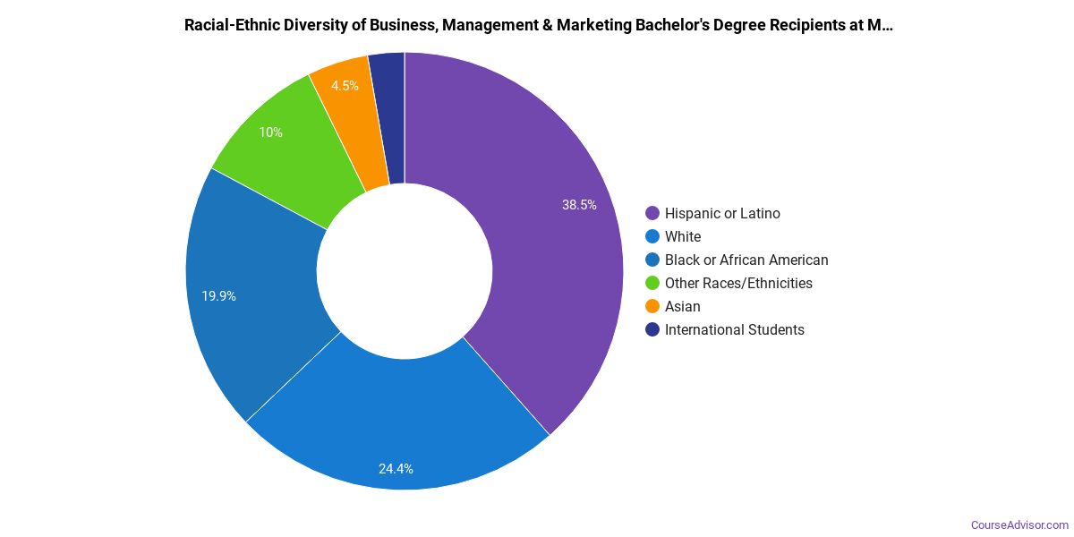 The following table and chart show the race/ethnicity for students who recently graduated from Mercy College with a bachelor's in business, management & marketing.