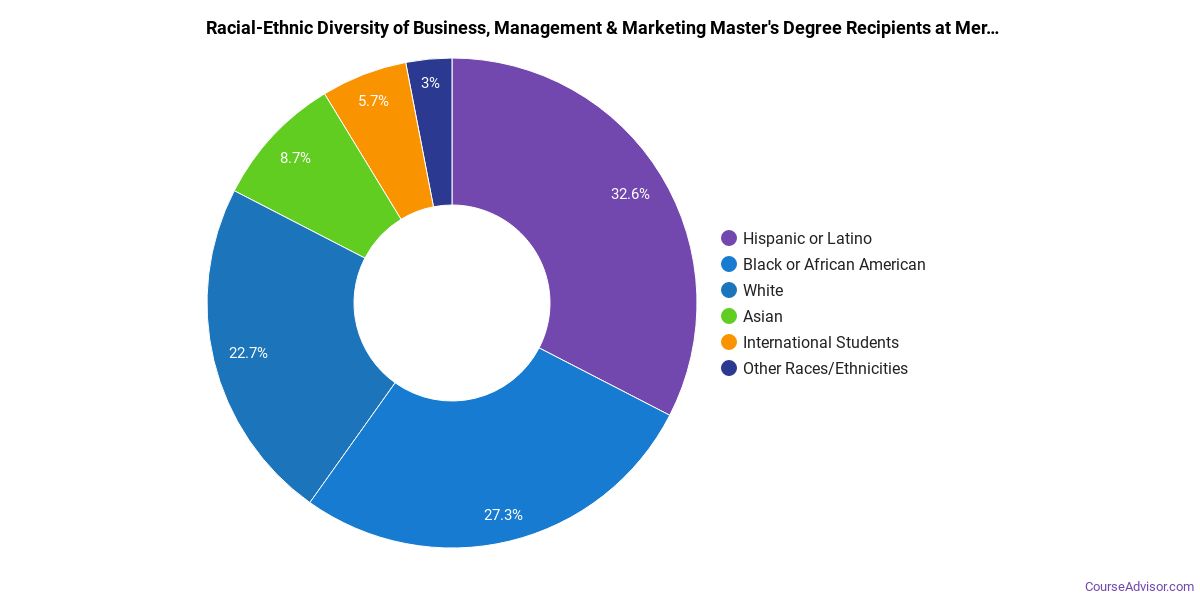 The following table and chart show the race/ethnicity for students who recently graduated from Mercy College with a master's in business, management & marketing.