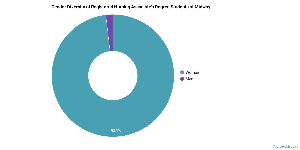 About 95% of those who receive a bachelor's degree in registered nursing at Midway are white. This is above average for this degree on the nationwide level.