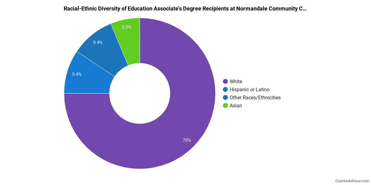 The majority of those who receive an associate's degree in education at Normandale Community College are white. Around 77% fell into this category, which is below average for this degree.