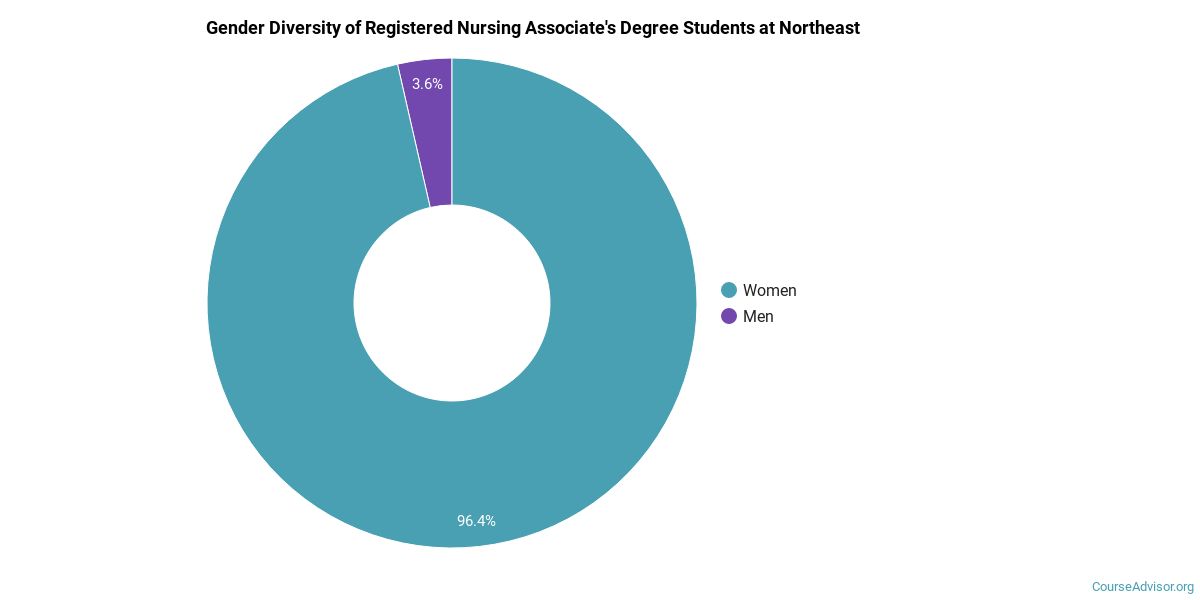 The majority of those who receive an associate's degree in registered nursing at Northeast are white. Around 80% fell into this category, which is below average for this degree.