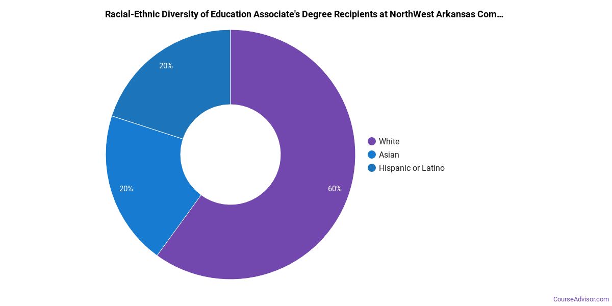 The majority of those who receive an associate's degree in education at NWACC are white. Around 70% fell into this category, which is below average for this degree.