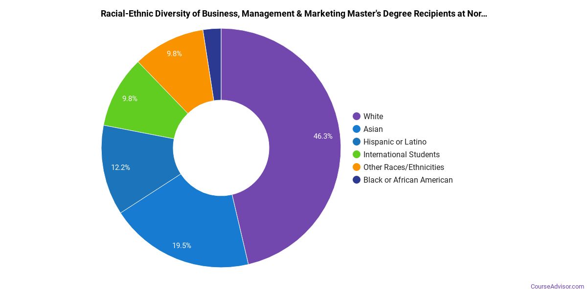 The following table and chart show the race/ethnicity for students who recently graduated from Northwest University with a master's in business, management & marketing.