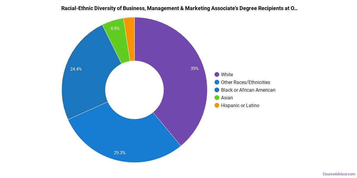 The majority of those who receive an associate's degree in business, management & marketing at OCU are white. Around 63% fell into this category, which is below average for this degree.