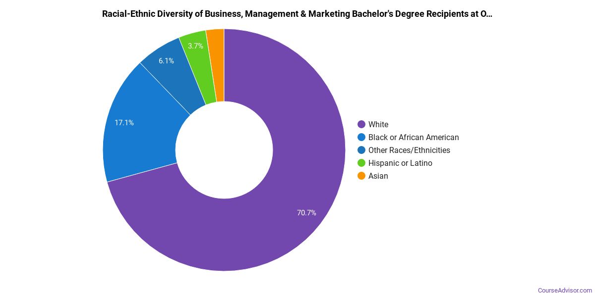 About 72% of those who receive a bachelor's degree in business, management & marketing at OCU are white. This is above average for this degree on the nationwide level.