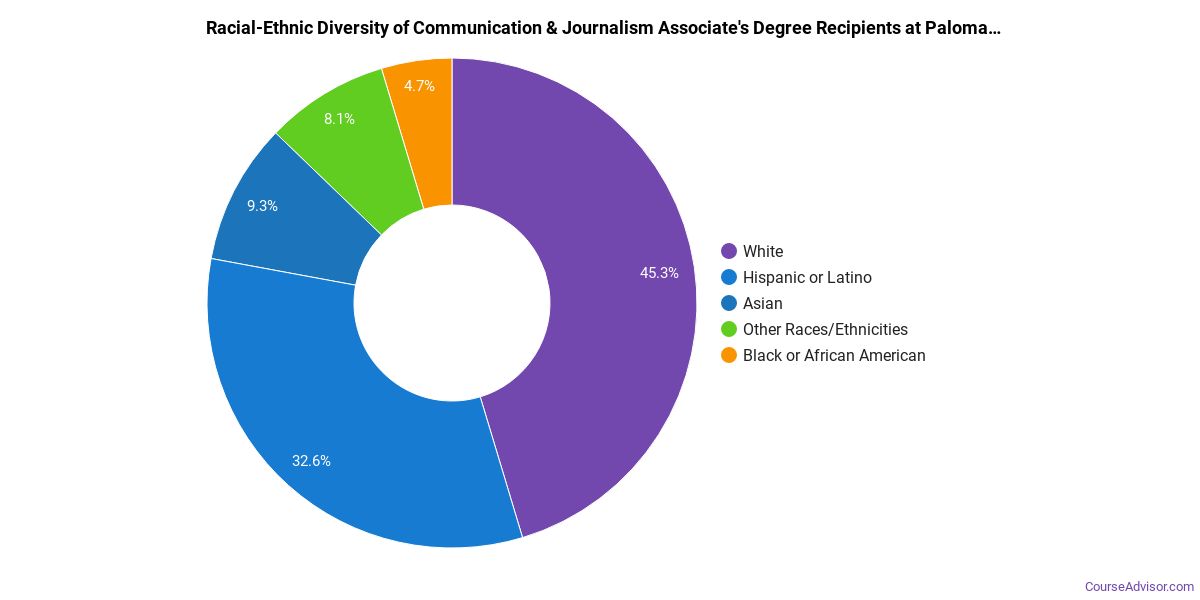 Palomar College does a better job with serving racial-ethnic minorities than the typical school does. Its associate's program in communication & journalism graduates 28% more racial-ethnic minorities than the nationwide average.*