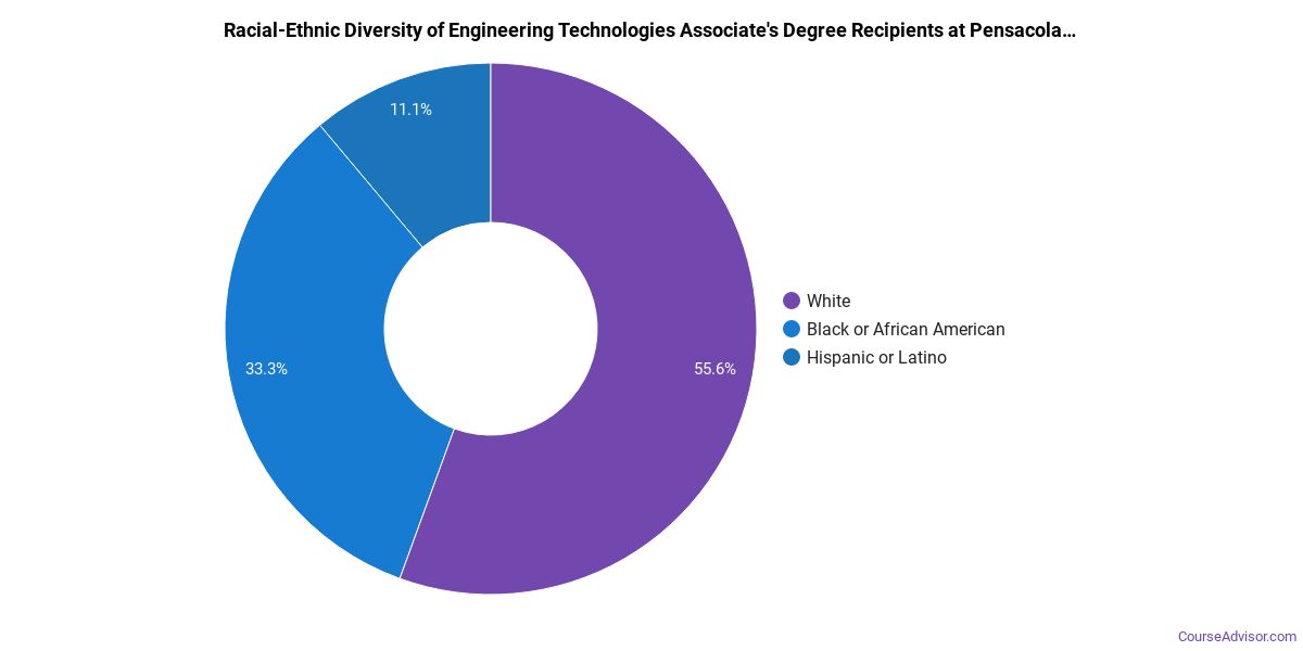 The majority of those who receive an associate's degree in engineering tech at Pensacola State are white. Around 77% fell into this category, which is below average for this degree.