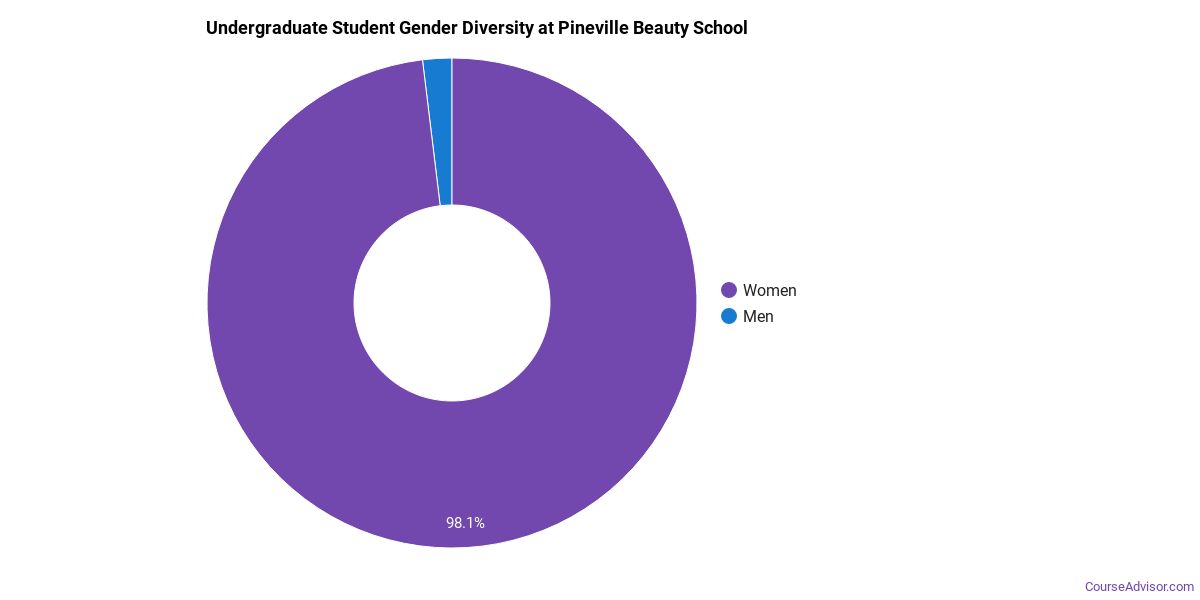 Of the 52 full-time undergraduates at Pineville Beauty School, 2% are male and 98% are female.